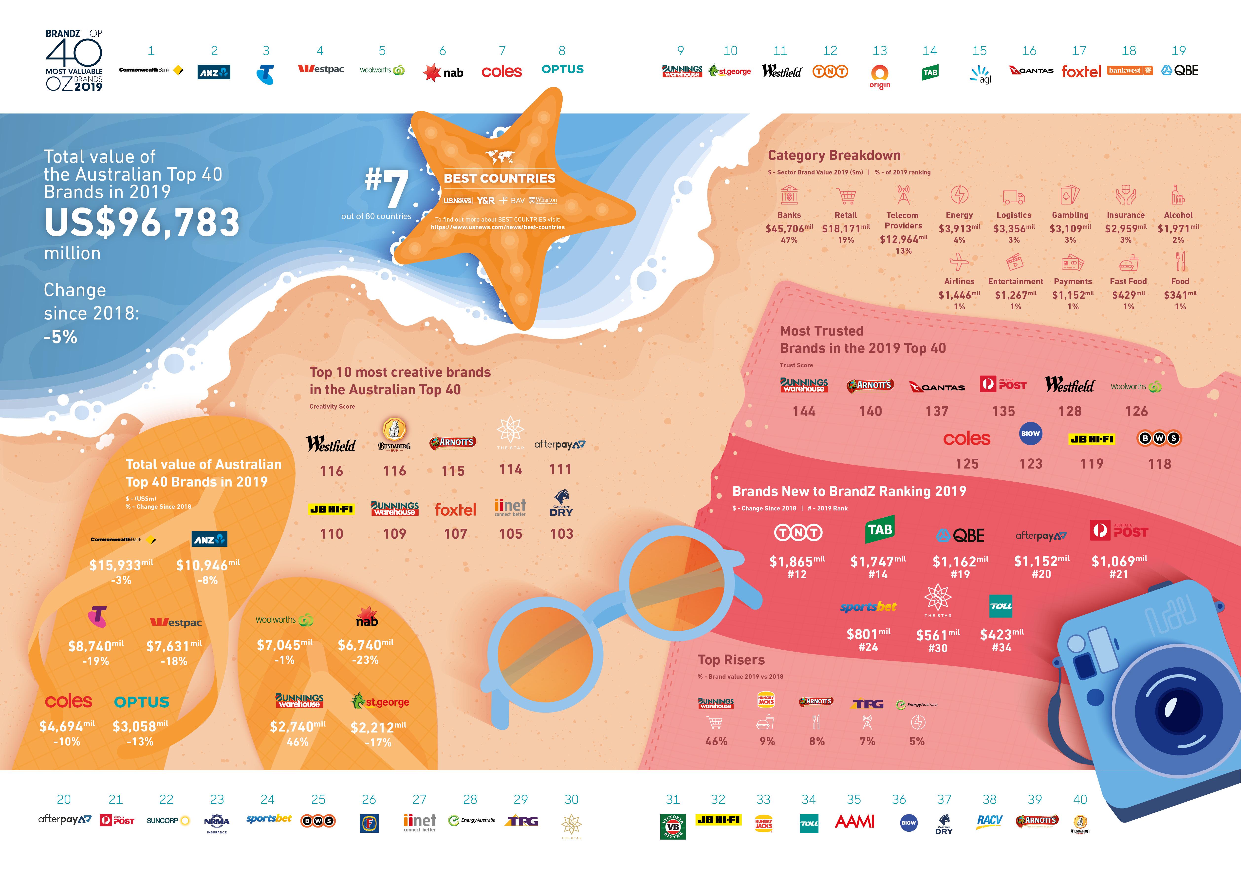 - Brands from 13 categories make the ranking in 2023, with six banking brands and ten retailers dominating the Top 40, led by Woolworths (No.3; US$11.7bn)