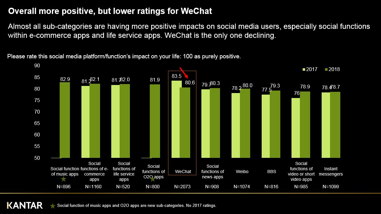 • WeChat, whose penetration rate remains nearly 100%, is the only social media app that people are less positive with compared to last year;