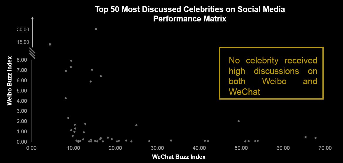 At an individual level, this trend is also true for celebrities. No celebrity achieved high-volumes of buzz on both the Weibo and WeChat platforms.