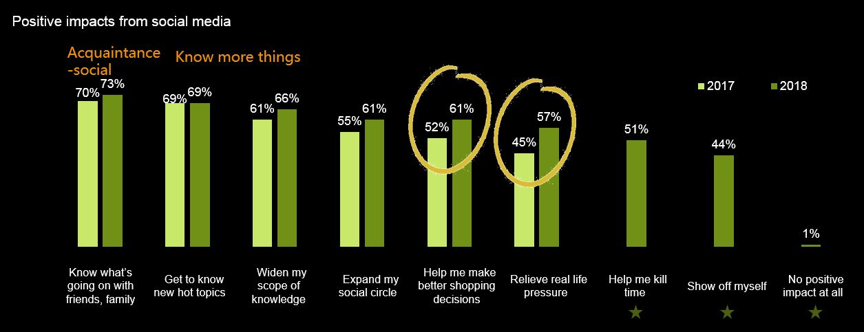 • 57% users feel social media helps them “relieve from pressure in real life”, up 12 percentage points from last year, and the biggest increase;