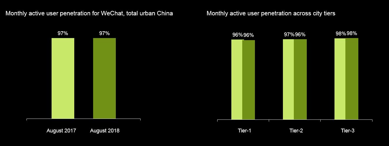 • WeChat have saturated its growth potential, with its monthly active penetration rate levelled with last year at 97% and there was almost the same across all city-tiers;