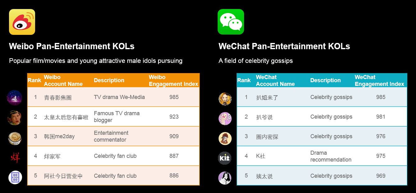 • Entertainment Key Opinion Leaders (KOLs) are the only KOL category to bridge the Weibo/WeChat divide.