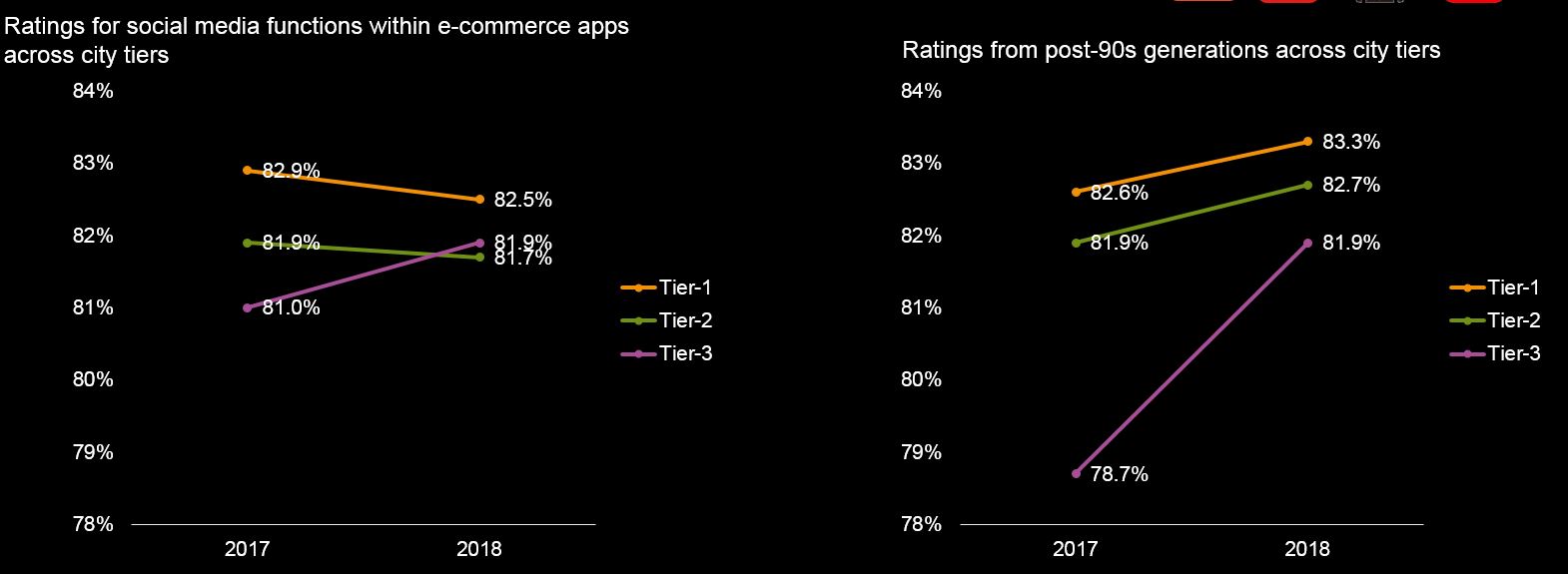 • The satisfactory rating for social functions of e-commerce apps grew a little from last year’s high base. The increase is most prominent among young people (post 90s) in tier-3 cities;