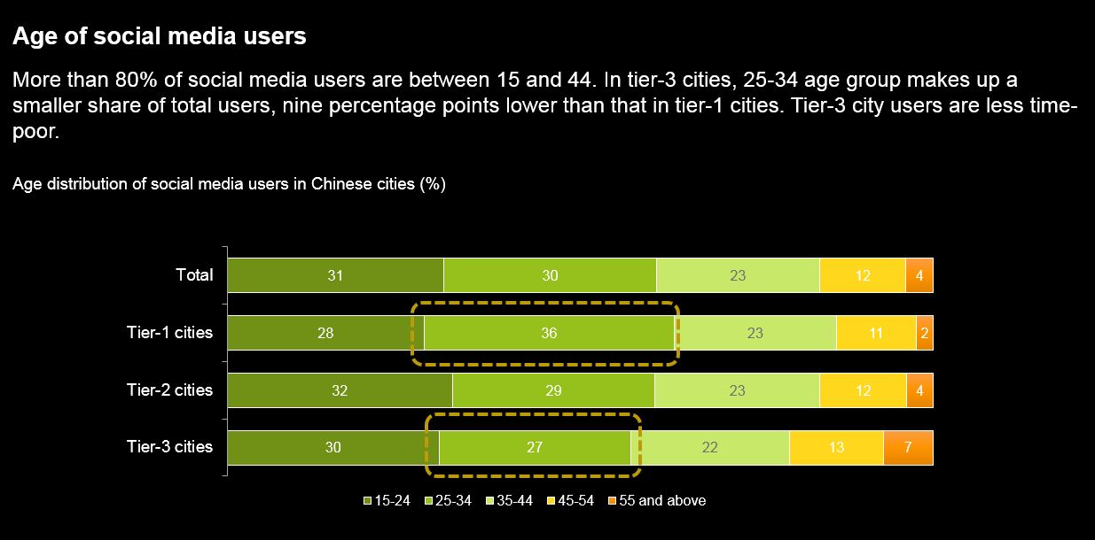 Illustrating the diversity, in tier-3 cities, there are almost 10 percentage fewer social media users in the 25-34 year age group compared to teir-1 mega cities like Shanghai and Beijing. (note 3) This trend is driven by the increased percentage of students and retired people in the smaller cities, who are more willing to try more time-consuming apps, such as short format video apps and social shopping apps. These apps typically garner momentum from smaller cities and eventually become increasingly popular in big metropolitans. Douyin and Pinduoduo are examples of this growth path. At the same time, because of their enormous penetration rates, “older” social media platforms WeChat and Weibo hardly had any meaningful growth.