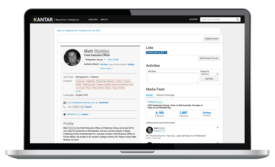 Localiza contactos relevantes y audiencias influyentes para tu marca, como periodistas de radio o prensa e influencers en medios online. Nuestro equipo realiza millones de actualizaciones e incorporaciones al año, por lo que los datos de contacto se actualizan de manera constante.