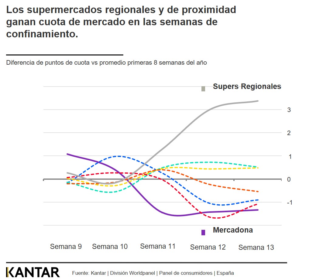 Siguiendo con la tendencia marcada en semanas anteriores, durante la semana del 23 al 29 de marzo los supermercados regionales continuaron ganando cuota de mercado alcanzando el 15,5% del total de ventas de gran consumo, 3,4 puntos más que la semana previa al confinamiento (9 al 15 de marzo). Ahora los consumidores están comprando en la tienda más cercana que es, o bien una cadena de su región, o bien una de las más de 4.000 tiendas de DIA.