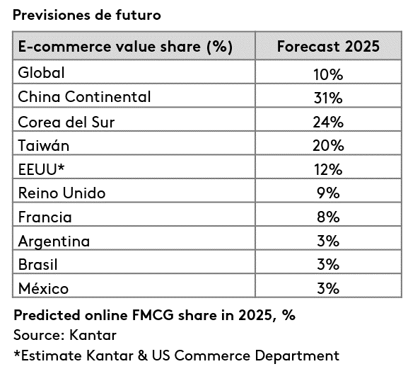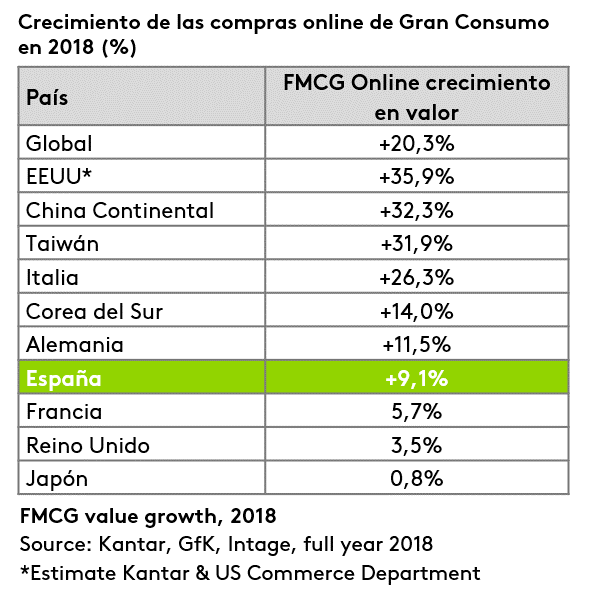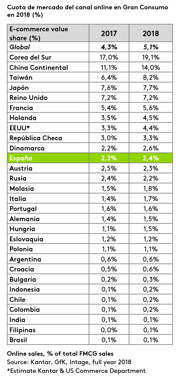 El gasto online mundial crece un 20,3% y representa el 5,1% del mercado global de gran consumo. Los Estados Unidos y la China Continental, un año más, son los países que más han contribuido a este incremento, con crecimientos del +35.9% y +32.3% respectivamente, impulsados por el éxito de Amazon, Alibaba, JD.com y Walmart, seguidos de Taiwán (+31.9%). Los países asiáticos siguen siendo los que la cuota de mercado del e-commerce es más grande, liderados por Corea del Sur con el 19,1% del total de compras de gran consumo.