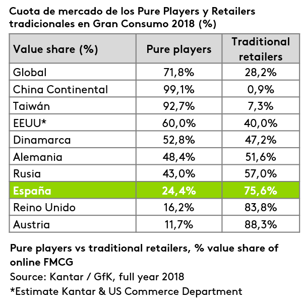 En nuestro país, los grandes grupos de distribución tradicional siguen liderando el mercado online con sus plataformas web, donde los pure players siguen creciendo, aunque muy lentamente, alcanzando el 24,4% de la cuota de mercado, según el informe que analiza un periodo de 12 meses a cierre de diciembre de 2018. Una presencia muy limitada en comparación con los países asiáticos, donde esta está más que consolidada: sólo en Taiwán representan el 92.7% del mercado de productos de gran consumo online.