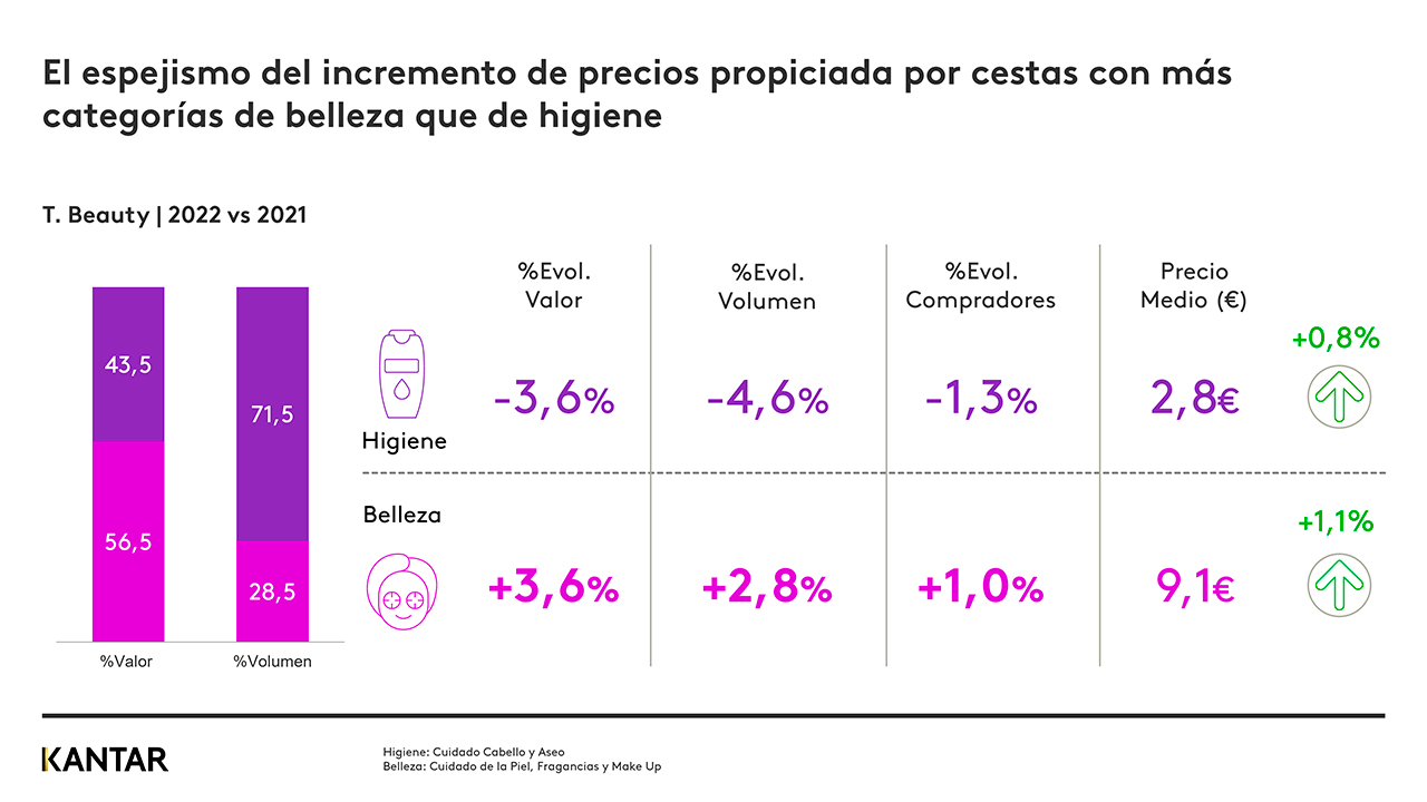 A pesar de que la inflación no se ha trasladado al Beauty, la subida en el precio de los productos ha sido propiciada por cestas con más categorías de belleza que de higiene, lo que ha hecho encarecer la compra por el mix de productos seleccionado. No obstante, los productos de belleza adquiridos son de menor valor, según los datos compartidos por Kantar Worldpanel.