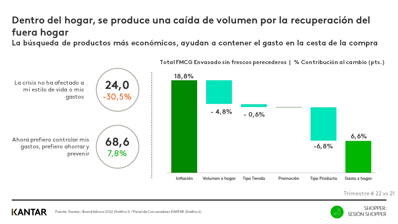 La inflación y su repercusión mediática han pasado a formar parte del día a día de la sociedad. Este hecho está suponiendo grandes cambios en el shopper y en el sector del Gran Consumo. Dentro del hogar, la caída de volumen continúa marcada por el trasvase al consumo fuera hogar. Aunque la búsqueda de productos más económicos ha ayudado a contener el gasto en la cesta de la compra. Estas son algunas de las conclusiones que se extraen del webinar 'Recetas para adaptarse a los cambios del shopper' el tercero del ciclo Perspectivas 2023 de la división Worldpanel de Kantar, disponible bajo demanda.