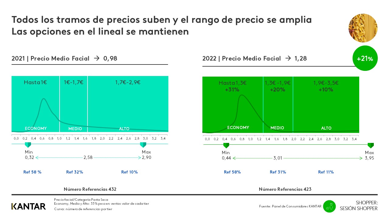Los precios suben en todos los tramos y su rango se amplía, aunque las opciones de gama alta, media y económica en el lineal se mantienen. Esta situación implica que el consumidor se fije más en el precio y en los lineales que antes. De los consumidores encuestados, el 62,7% confirma, un 5,1% más que el año pasado, que siempre compara precios entre diferentes marcas antes de elegir. En ese contexto, las elecciones del shopper están más polarizadas, afectando, sobre todo, al rango de precios intermedios.