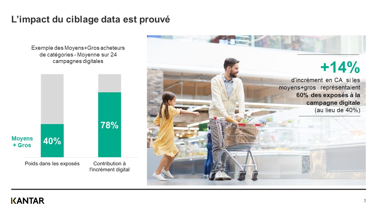 Toutes les marques veulent attirer de nouveaux acheteurs mais encore faut il aller chercher les bonnes personnes ! Se concentrer sur les foyers qui comptent reste essentiel dans une stratégie media, surtout dans un objectif d’optimisation des dépenses publicitaires. Construire des cibles basées sur du comportement d’achat est une manière efficace d’y parvenir avec un impact réel prouvé. En s’adressant ainsi directement aux moyens et gros acheteurs de la catégorie, l’efficacité s’en trouve maximisée, notamment grâce au potentiel d’achat représentés par ces foyers. Sur 24 campagnes digitales étudiées, la contribution de cette cible à l’incrément atteint 78% alors qu’ils représentent 40% des exposés.