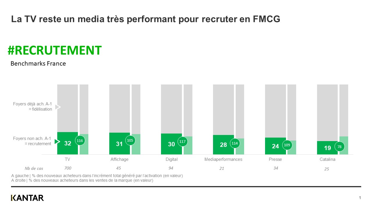 Non ! Nous avons comparé les campagnes TV les plus recruteuses, c’est-à-dire celles pour lesquelles les nouveaux acheteurs pèsent le plus dans l’incrément généré, par rapport aux moins recruteuses. Nous constatons qu’il n’existe aucune logique entre la capacité à gagner des consommateurs et le ROI, la puissance ou l’investissement. Nous avons également observé le niveau de pénétration des marques, la taille des marchés ou encore leur fréquence d’achat, là non plus, nous n’observons aucun lien évident. La capacité à recruter pour une marque sera donc plus certainement liée à la créa ou au ciblage. Cet insight démontre l’importance de bien déterminer en amont ses objectifs et les KPI’s à étudier : une vague très recruteuse ne sera pas systématiquement rentable à court terme. Par exemple, la marque Dolce Gusto voulait avant tout attirer de nouveaux acheteurs. Même si la TV était le media le moins ROIste, elle se positionnait pourtant en seconde place quand on se concentrait sur sa capacité à recruter. Idem lorsque fut analysée la mission secondaire de la campagne : rajeunir la marque. La radio, avant dernière en rentabilité, s’est hissée sur le podium quand l’impact sur les moins de 50 ans a été calculé.