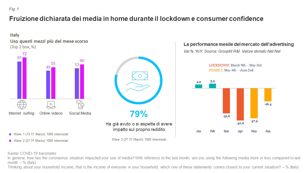 Non era difficile immaginare che la dieta mediatica degli italiani sarebbe cambiata: il COVID-19 Barometer* di Kantar ha mostrato modelli di fruizione dei media simili nei 30 mercati monitorati nel periodo della prima ondata del virus. Con il progredire della pandemia in ogni paese, abbiamo visto crescere il consumo di media su tutti i touch-point in-home. Per quanto riguarda l'Italia, a marzo il 72% dei consumatori ha dichiarato che la loro navigazione in internet era aumentata rispetto al mese precedente, la fruizione di video online del 55% e dei social media del 60% (vedi tabella 1). Nel frattempo, i consumatori erano sempre più preoccupati per il loro futuro e per l'economia; il 79% aveva avvertito, o si aspettava di avvertire, un impatto sul proprio reddito.