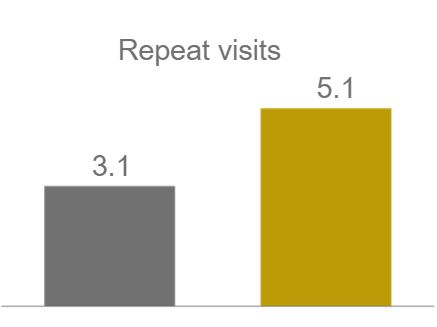 Tanto la satisfacción de los empleados como la de los clientes aumentó más de 15 puntos de índice en 3 años, lo que llevó a un aumento significativo del número de visitas repetidas.