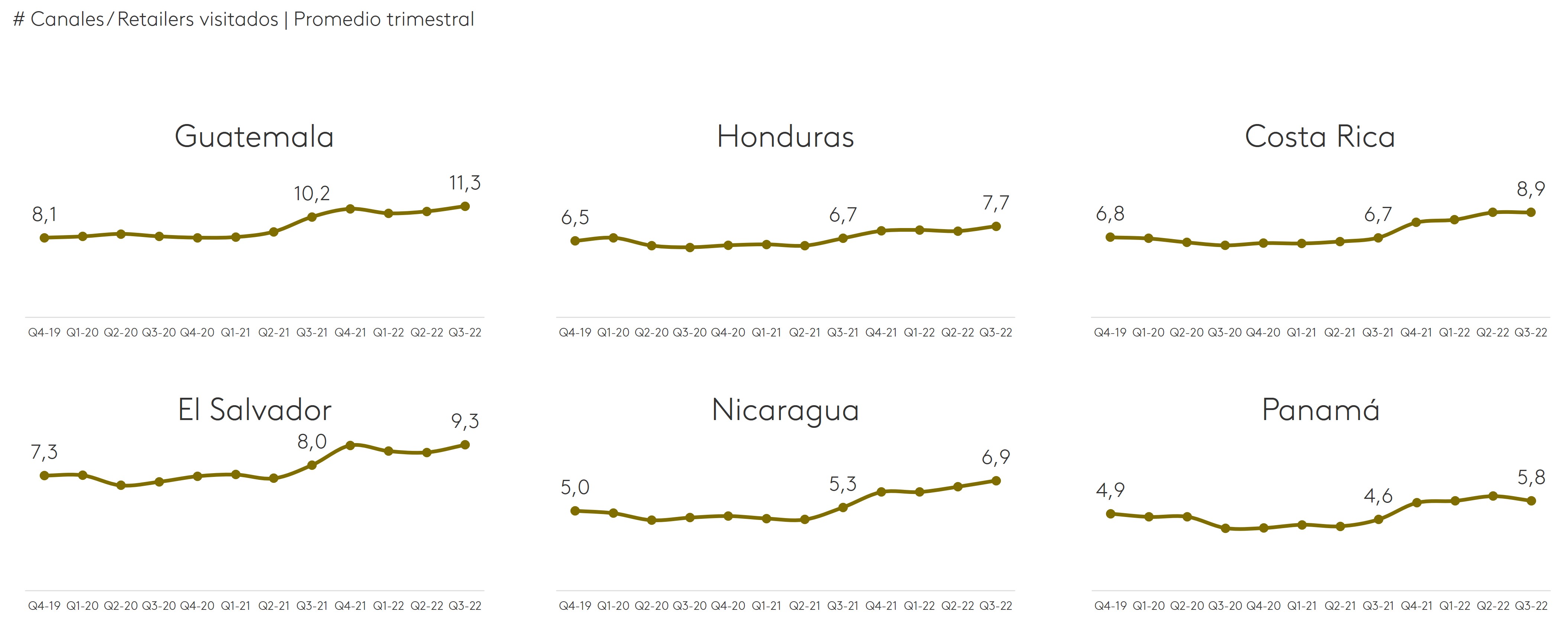 Guatemala y El Salvador son los países que versus el 2019, tienen el mayor aumento de convivencia entre canales, visitando 11 y 9 lugares diferentes respectivamente. Mientras que en Costa Rica el consumidor visita 8, siendo Nicaragua y Panamá los países con menos cantidad de visitas.