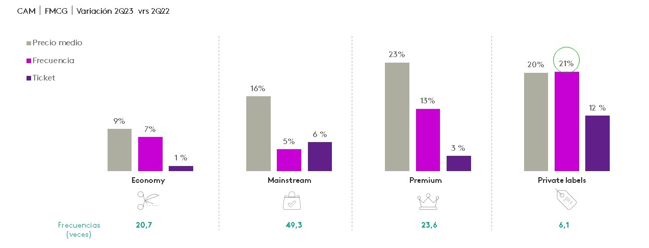 La frecuencia es la variable que impulsa que el shopper compre las marcas del retail. El precio medio crece en todas las marcas, pero donde destaca más es en las Marcas Premium con 23%, seguido de Marcas Privadas con 20%, Mainstream con 16%, y Marcas Económicas, con un crecimiento más moderado de 9%. El ticket es positivo en todos los casos, es decir, se tiende a gastar más, pero totalmente conectado con el aumento de precios causado por la inflación.