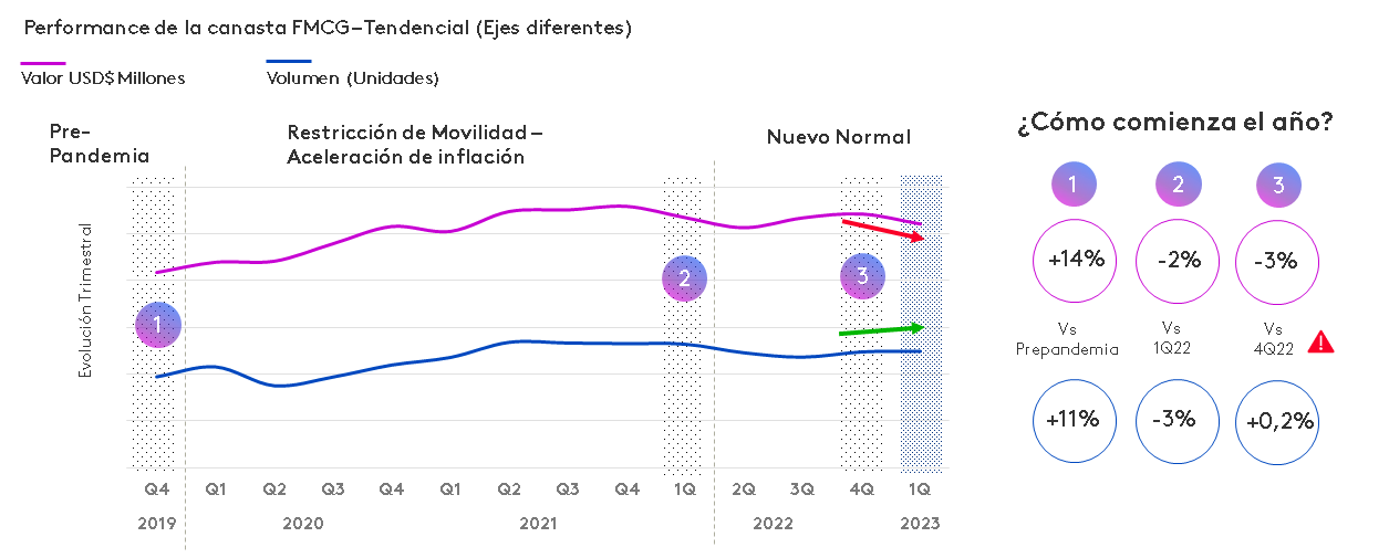 Para el mismo periodo de 2022 se observa la caída en valor y volumen debido al último repunte que hubo de COVID-19 con la variante de Ómicron, donde la gente estaba más en casa. Por último, comparando contra el último trimestre del año pasado, es decir a corto plazo, la tendencia de la canasta de consumo masivo ecuatoriana es estable o inclusive un poco mayor en volumen, pero se está pagando 3% menos.