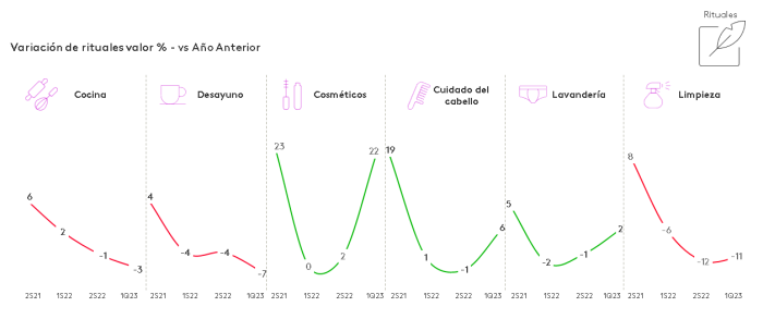 Sin restricciones de movilidad, observamos cómo a corto plazo empiezan a recuperarse rituales de socialización: Cosméticos, Cuidado del Cabello y Lavandería.