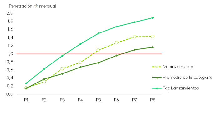 Por ejemplo: los lanzamientos exitosos alcanzaron el primer punto de penetración al tercer mes, mientras que el promedio de la categoría recién lo logra en el sexto mes
