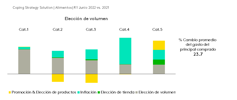 En el siguiente ejemplo podemos apreciar que dentro de un grupo de categorías de Alimentos la inflación no es el principal agente de cambio en el comportamiento del consumidor, vemos como las familias se apalancan de un menor volumen para hacer rendir su gasto.