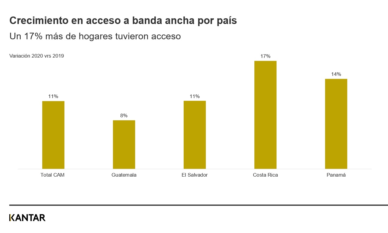 En 2020 un 11% más de centroamericanos tuvieron acceso a banda ancha de internet, durante la pandemia se desarrollaron muchas actividades que dependía de la conectividad en el hogar, por ejemplo un 37% pasaron su rato en redes sociales, 19% de centroamericanos durante el lockdown se entretuvieron con aplicaciones online para ver series o películas cómo Netflix, HBO, Amazon Prime, etc, y un 6% aprovecharon su tiempo para estudiar de manera online.