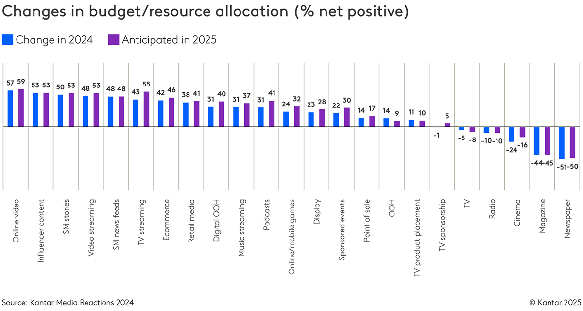 Consumer preference is the most important factor, with 60% of marketers claiming to consider it in their budget decisions. And consumers’ preferences are ever-changing, making it hard for marketers to stay on top of. In 2024, point of sale ads (POS) were the most preferred media channel for consumers, followed by cinema ads, sponsored events, newspaper ads and outdoor ads. However, none of these channels were among the channel’s marketers increased their spend most in. A net 22% of marketers said they increased their spend in sponsored events, which is the highest figure among the five. Cinema ads, for example, saw a big decline. They have instead increased their spend on digital channels like online video, influencer content, and social media stories. Although consumer preference is not the only element to consider, the mismatch between what consumers feel and what marketers spend on is evident in this picture.