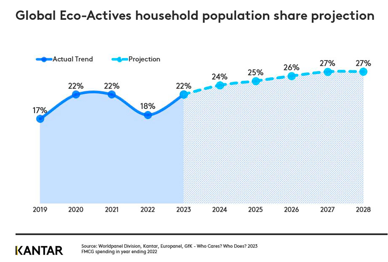 Who Cares? Who Does? identifies that the ‘Eco-actives’ segment, made up of the most eco-conscious consumers, has rebounded from its 2022 cost of living crisis-related decline. In 2023, the sustainability-conscious shopper segment rebounded to represent 22% of shoppers, compared with 18% in 2022 and 22% in 2021. These consumers spend almost $500 billion in the FMCG market each year, with this projected to reach $1 trillion by 2027.