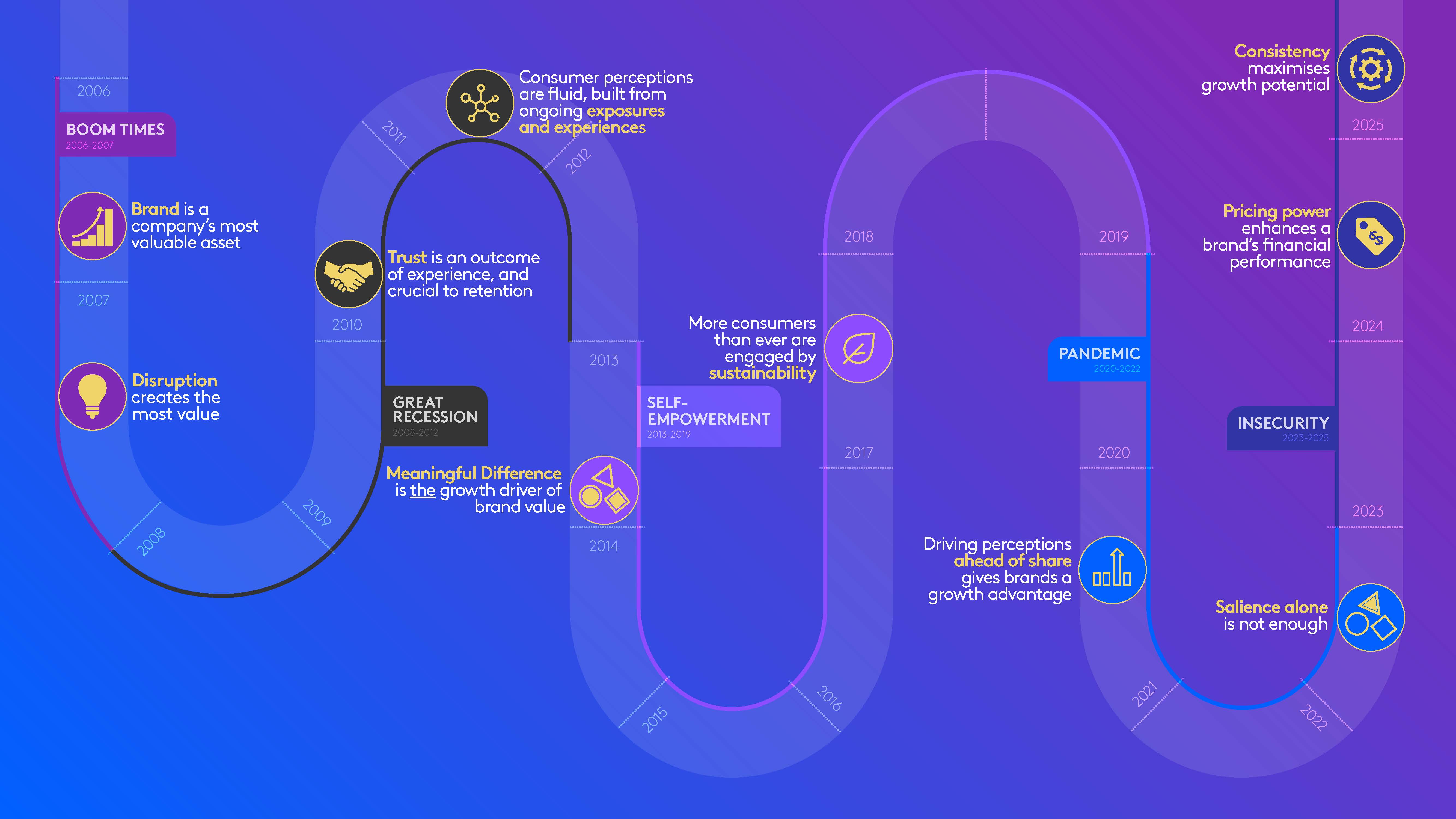 These insights will help marketers build strong and resilient brands more effectively. They have been stress tested by all the volatility and uncertainty that has characterized the last 20 years. Nearly every strategic landscape has transformed in this time: from media to geopolitics, from the environment to the stock market, change has been the most reliable constant.