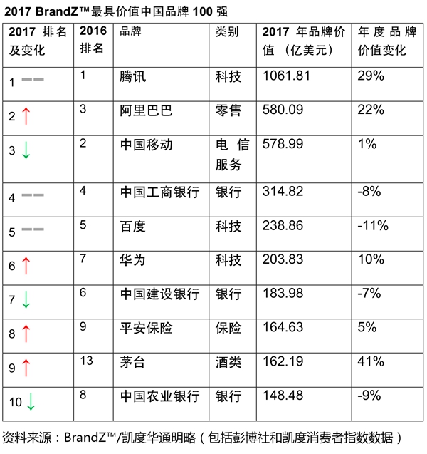 BrandZ™最具价值中国品牌100强的品牌估值工作由凯度华通明略开展,方法上借鉴了BrandZ™全球最具价值品牌100强年度排名所采用的计算方法。2017年是全球最具价值品牌100强系列排名的第12届。