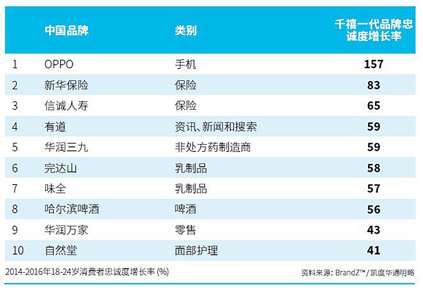 * 教育品牌学而思(排名第77)和新东方(排名第46)开始基础较低,但却引领品牌价值增长,品牌价值分别提高了58%和43%。两者都专注于课后辅导,应试准备和英语学习,切合消费者需求,通过推进教育这个国家优先战略为中国成人和儿童在国内和全球经济中取得成功。 * 千禧一代(相当于中国的80后和95前人群)在中国的商业和品牌的成功上扮演重要角色。想要增加他们的忠诚度,需要品牌更重视其独特个性。不同年龄段的消费者都希望得到有品质、值得信赖并让生活更加美好的产品或服务。但是这些人群则更倾向于选择知名的时尚品牌。BrandZ研究表明,在建立他们的品牌忠诚度上,手机品牌OPPO最为成功,品牌价值自2014年增长了157%。