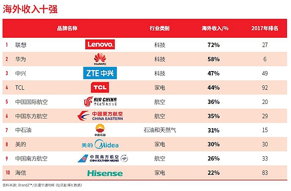 中国品牌也继续在海外市场强势进军。令人印象深刻的是,许多顶尖的科技品牌目前从海外销售中获得了很大比例的收入。在BrandZ™中国100强排行榜中,联想是最以出口为导向的品牌,它72%的收入来自海外;而华为和中兴分别有58%和47%的收入来自中国以外的市场。