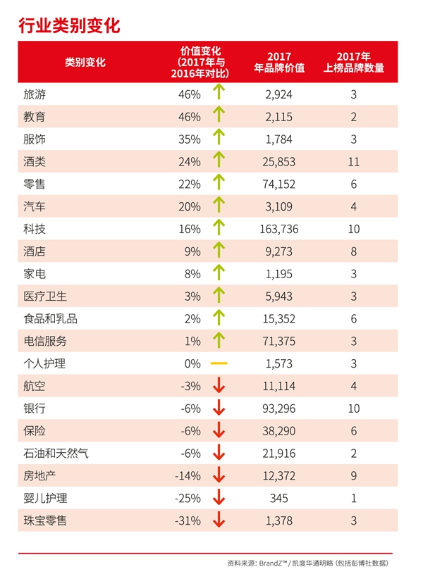 中国正向消费导向型经济转型,针对城市中产阶级的产品和服务品牌表现尤其出众。教育及旅行社行业以46%的增速成为增长最快的行业。但就品牌价值的绝对增长额度而言,大体量行业更为领先,上升最大的科技行业总品牌价值增长了226亿美元(+16%),零售行业增长了132亿美元(+22%)。