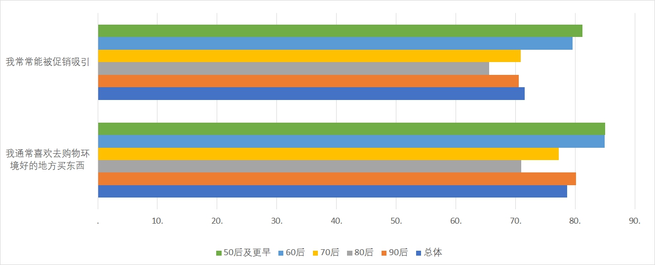 与此同时,80后对促销和购物环境却不像90后那么在意,可能是因为80后的已经有了足够的财力,所以对品质和品牌的追求超过那一点价格折扣。而80后的生活里购物对电商更依赖,而且生活大多进入了上有老下有小的阶段,没有那么多时间去光顾实体店逛街了。但大多数90后还处在未成家的生活状态,所以他们的闲暇时间多数是在购物空间度过,因此购物环境对他们来说很重要。